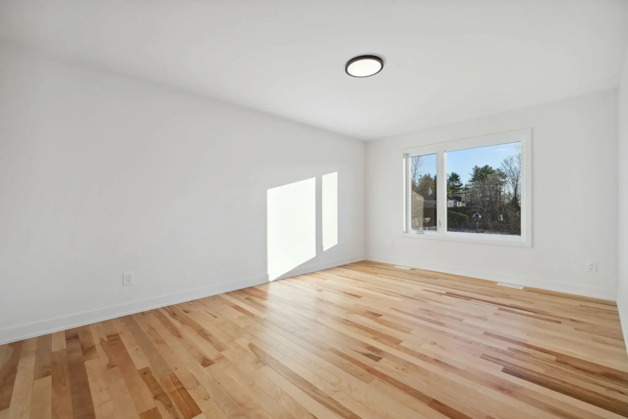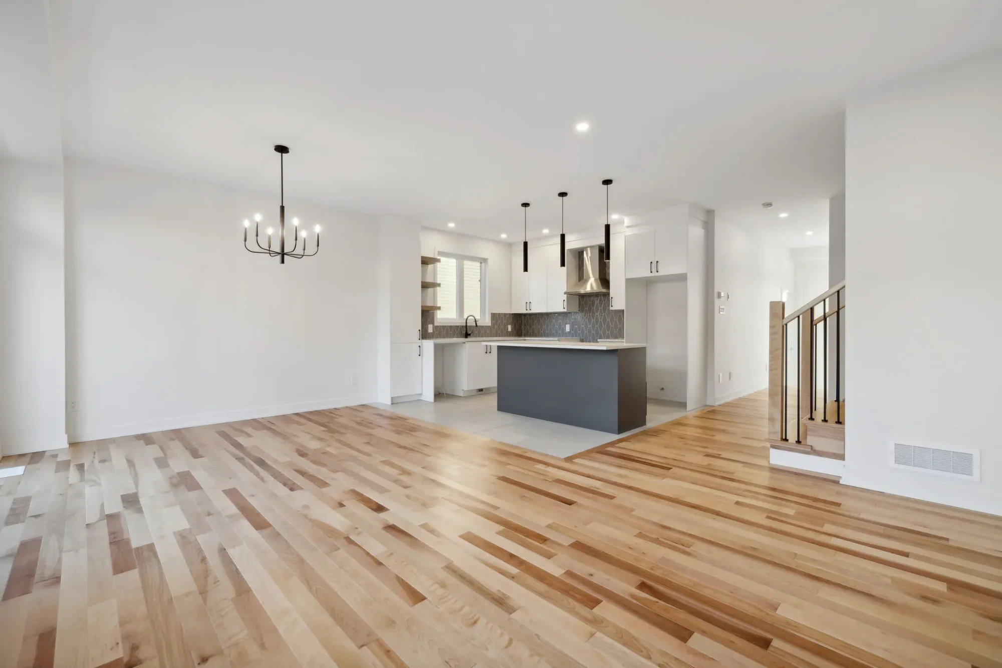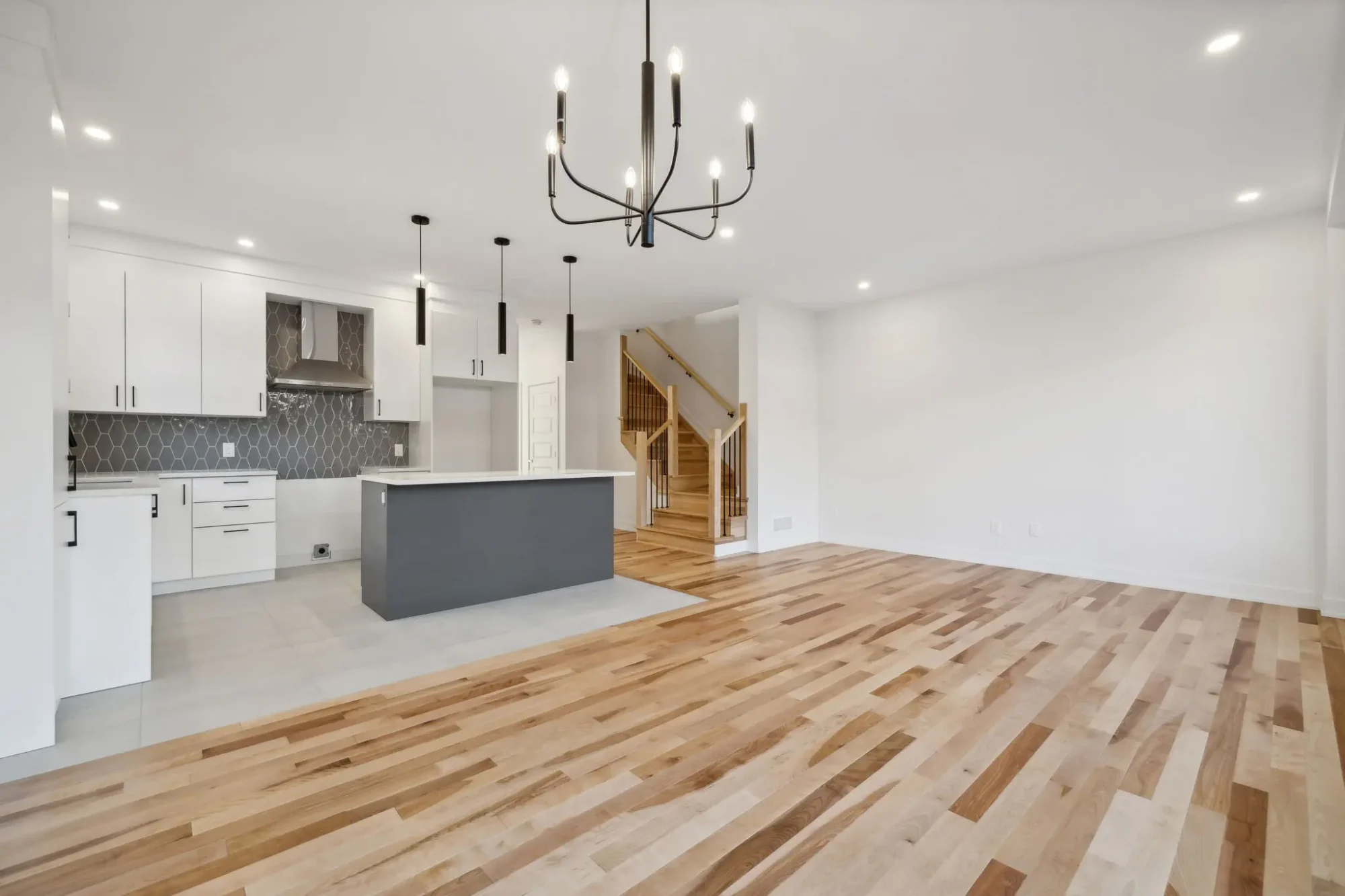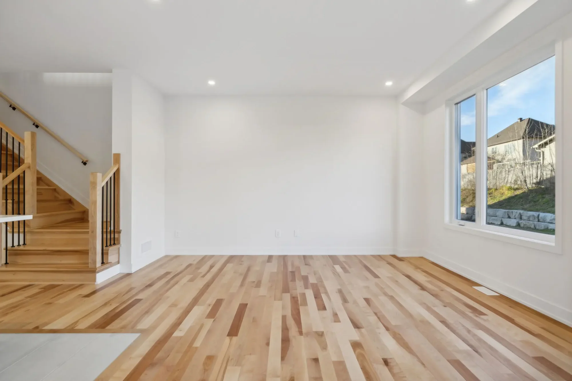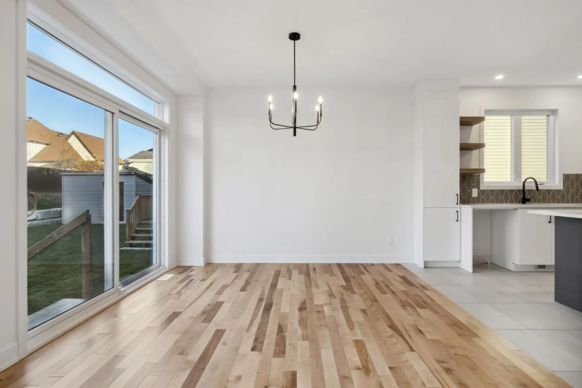 - Bois franc teint et vernis 3-1/4’’ au rez-de-chaussé, incluant les chambres